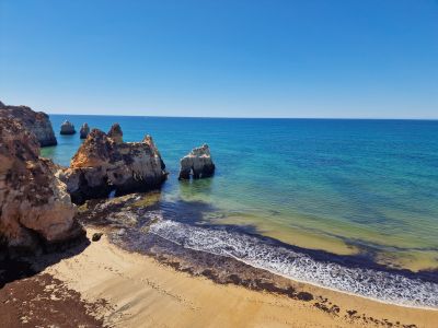 La spiaggia mostra l'evoluzione geologica della costa dell'Algarve attraverso le sue scogliere calcaree, modellate da secoli di erosione marina.