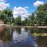 La riva presenta piattaforme che si estendono nell'acqua, accompagnate da sponde erbose e zone boschive che creano barriere naturali lungo il fiume.
