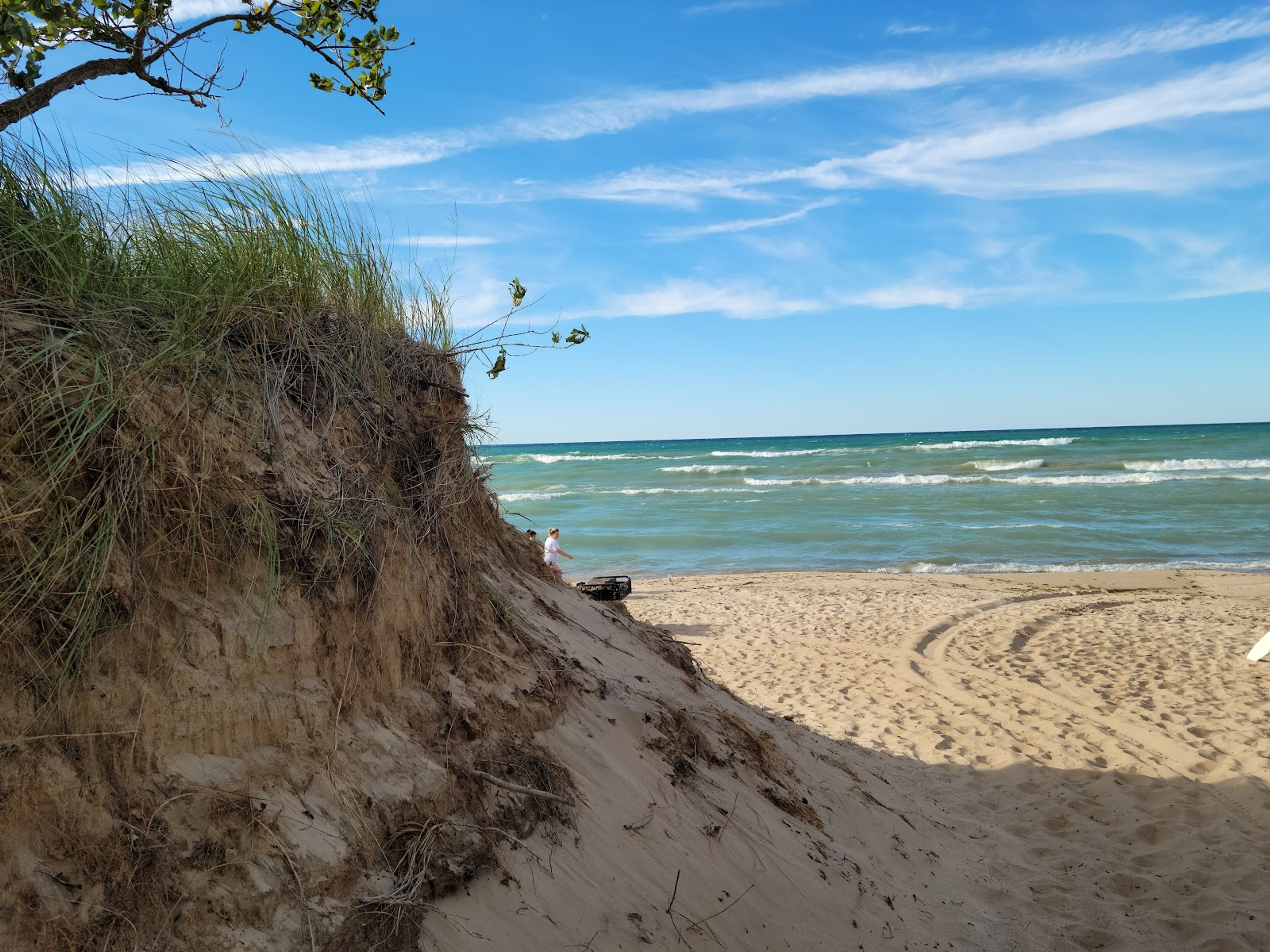 La spiaggia si estende lungo la riva meridionale del Lago Michigan, caratterizzata da formazioni di sabbia fine e vegetazione naturale per attività ricreative.