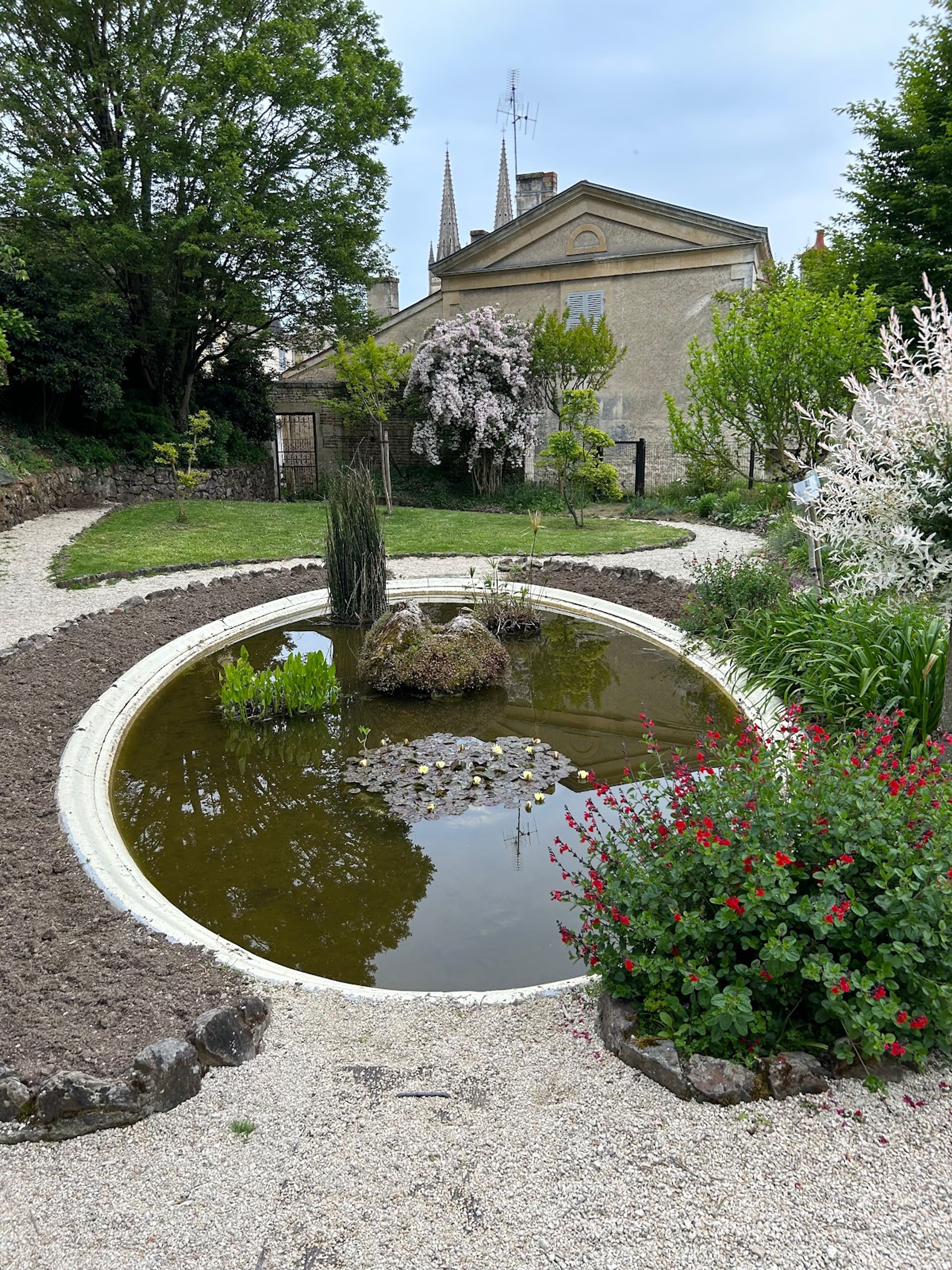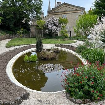 Il Viale Basso attraversa uno spazio verde con aiuole fiorite e costeggia il fiume Sèvre Niortaise su una superficie di calcare chiaro.