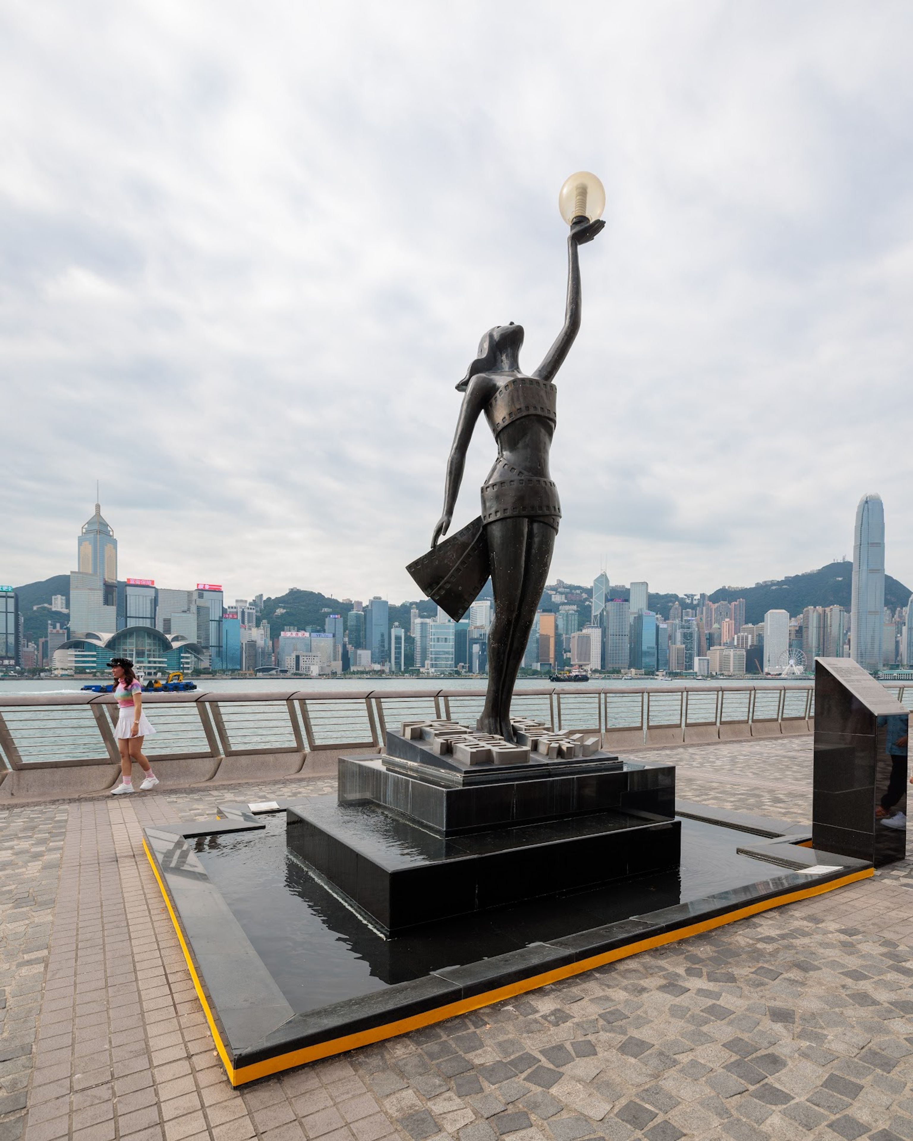 La scultura in bronzo di sei metri rappresenta la statuetta dei Premi del Cinema di Hong Kong, raffigurante una dea con una perla.