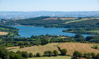 Il lago di Villefranche-de-Panat si estende su 192 ettari a 727 metri di altitudine, circondato dagli altopiani granitici del Massiccio Centrale.