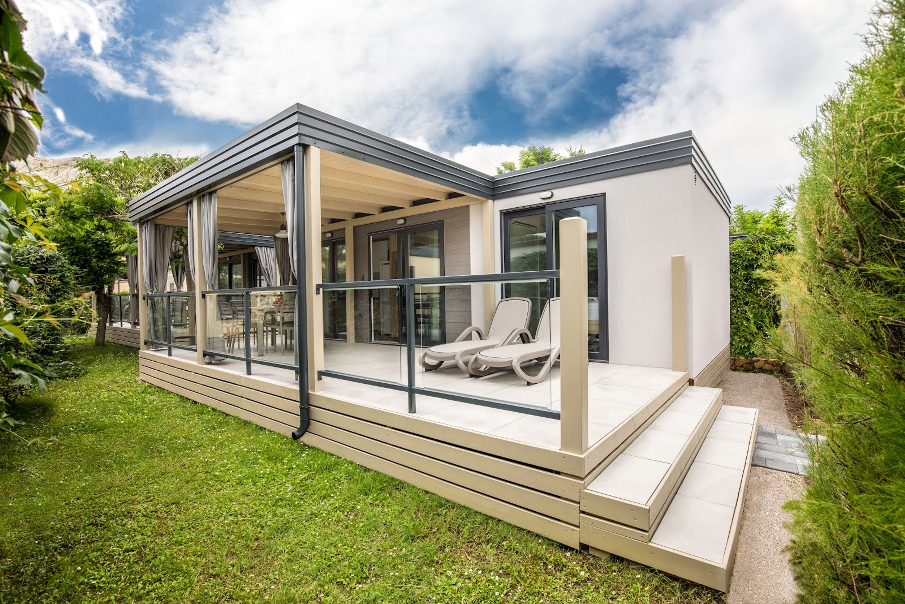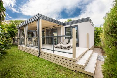 Il campeggio si estende su 10 ettari lungo una spiaggia di ciottoli di 1800 metri, offrendo case mobili e piazzole con allacci acqua ed elettricità.