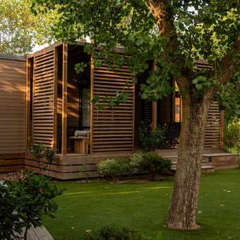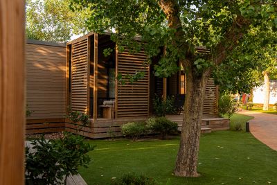 La struttura offre case mobili, tende safari con camere e cucine, oltre a piazzole dotate di elettricità, allacci idrici e accesso a due piscine.