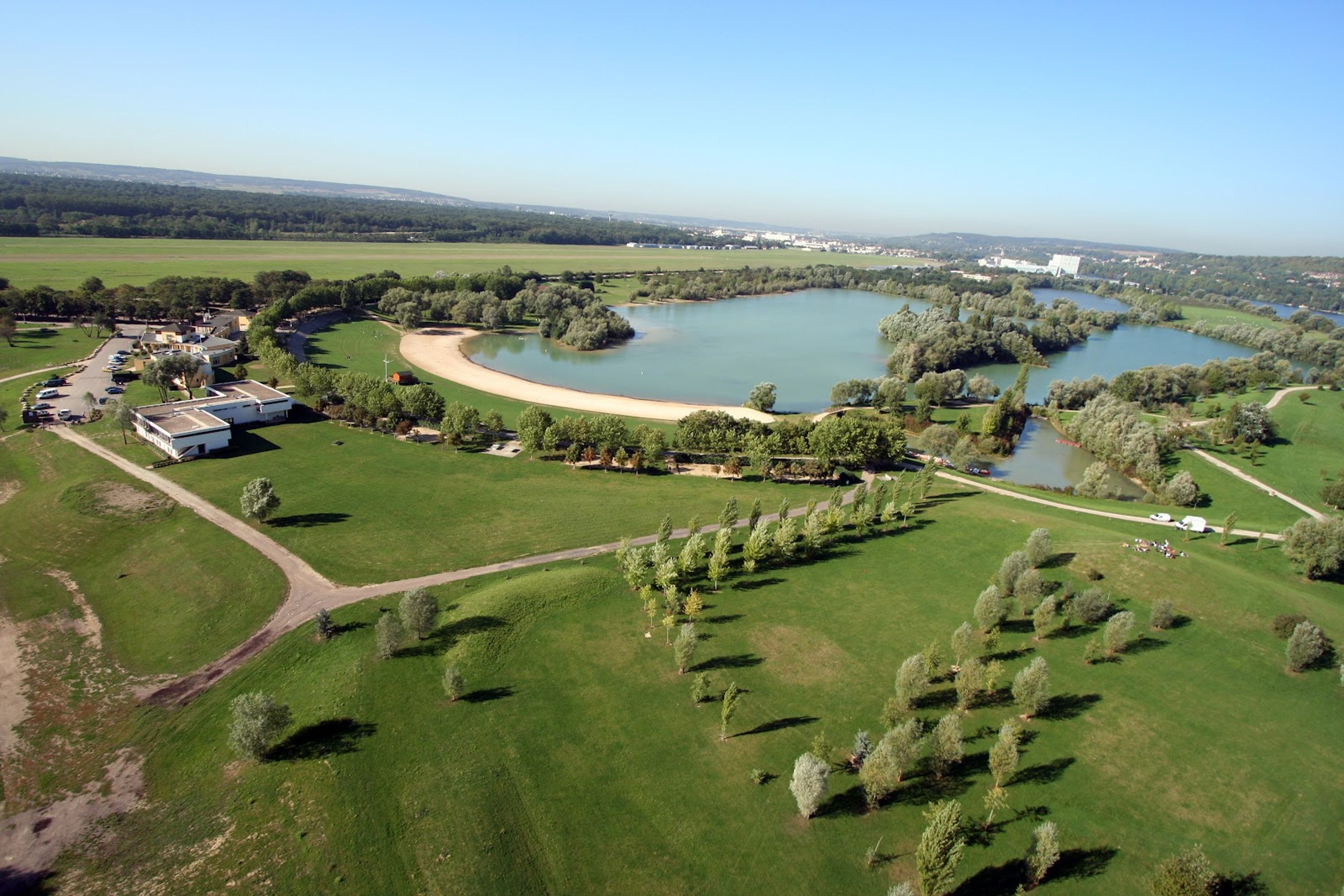 La Base de Loisirs du Val-de-Seine si estende su terreni naturali con un grande lago, campi sportivi e aree dedicate alle attività all'aperto.