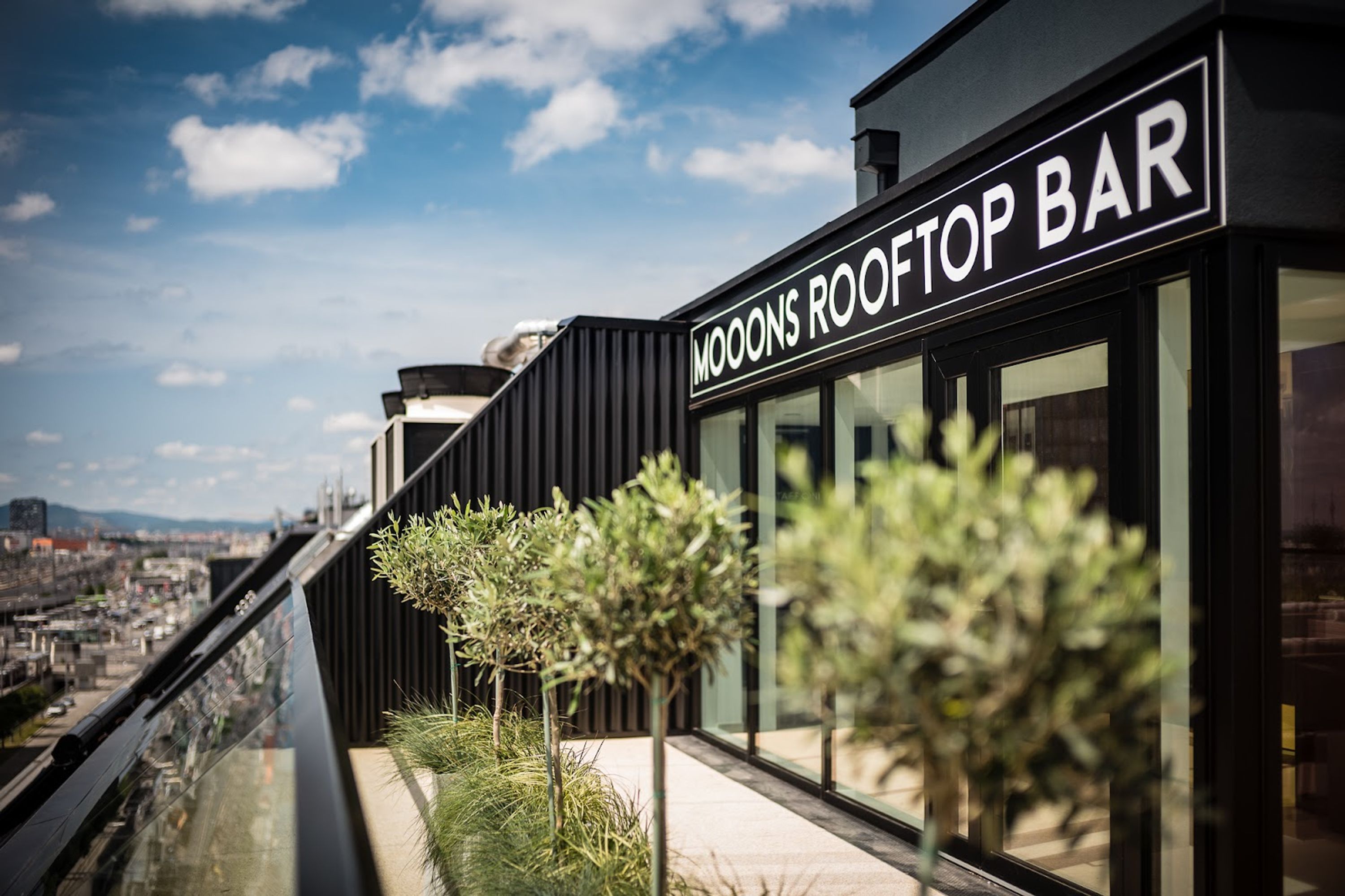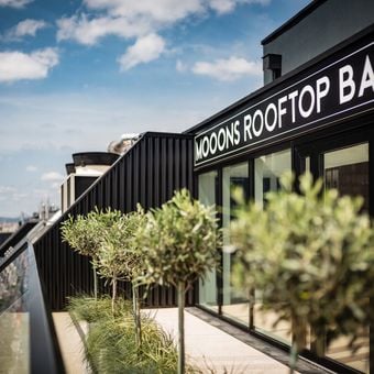 Moons Rooftop Bar dispone di una terrazza sopraelevata che offre viste panoramiche sullo skyline di Vienna, fornendo un ambiente moderno per gustare cocktail e bevande all'aperto.