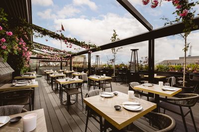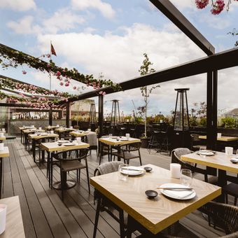 La terrazza sul tetto si trasforma in un punto di ritrovo serale vivace durante le serate DJ del weekend, estendendosi fino a tarda notte con DJ residenti che si esibiscono mentre gli ospiti gustano cocktail esclusivi e l'orizzonte illuminato di Londra.