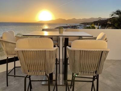 Las Amigas Rooftop Bar presenta una terrazza sopraelevata con viste panoramiche sui paesaggi vulcanici di Lanzarote e sull'oceano Atlantico, offrendo sistemazioni di seduta confortevoli ed elementi di design contemporaneo ispirati all'architettura tradizionale canaria.