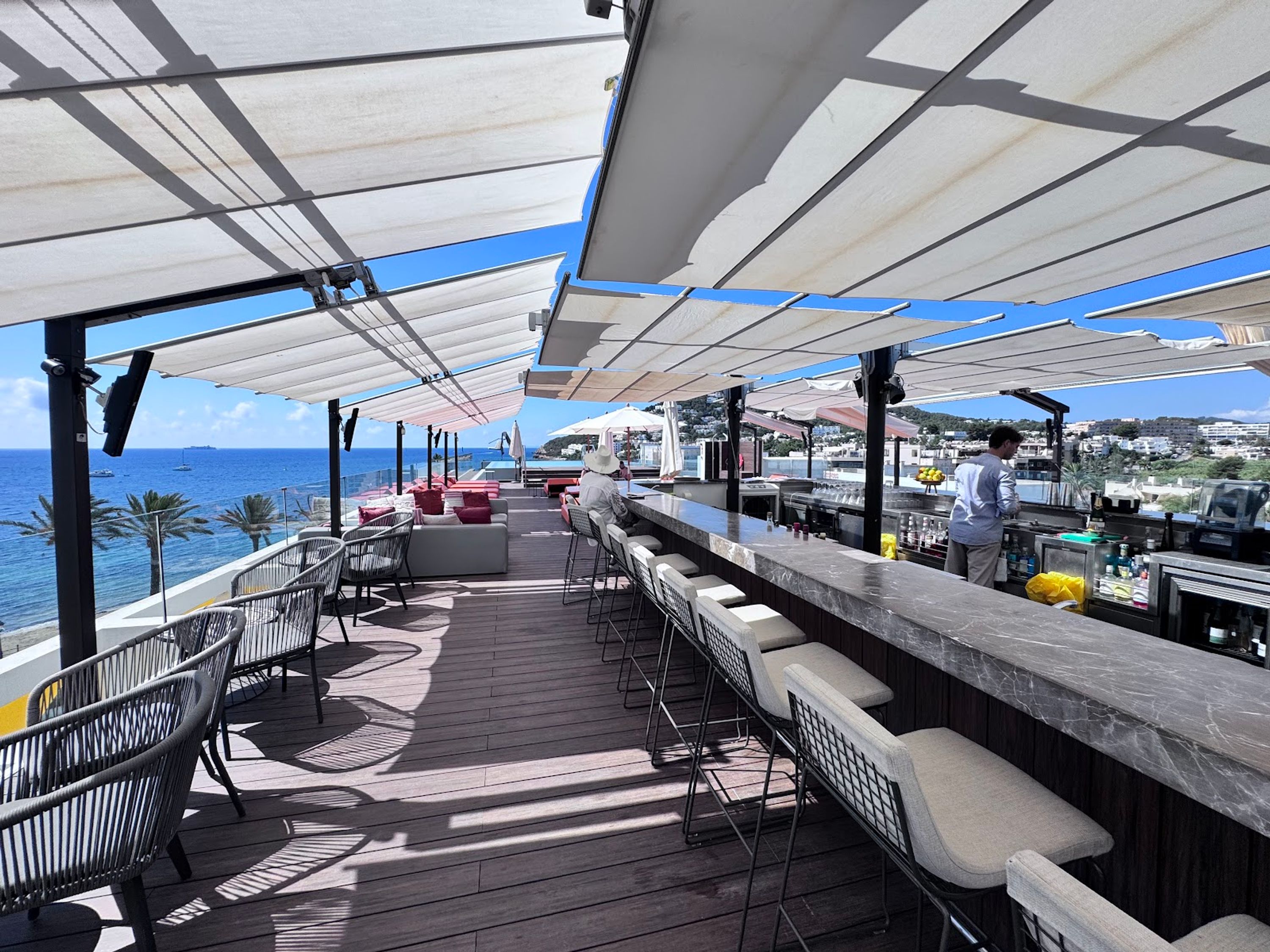 GLOW Rooftop, Bar su terrazza panoramica a Santa Eulalia del Río, Spagna.