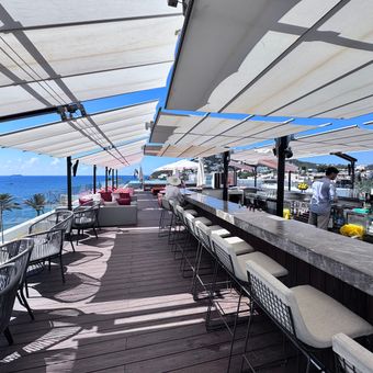 Questo locale sopraelevato si trova al sesto piano dell'hotel W Ibiza, con una piscina a sfioro, arredi moderni da salotto e viste panoramiche che spaziano sulle montagne di Santa Eulalia e sulla baia sottostante.