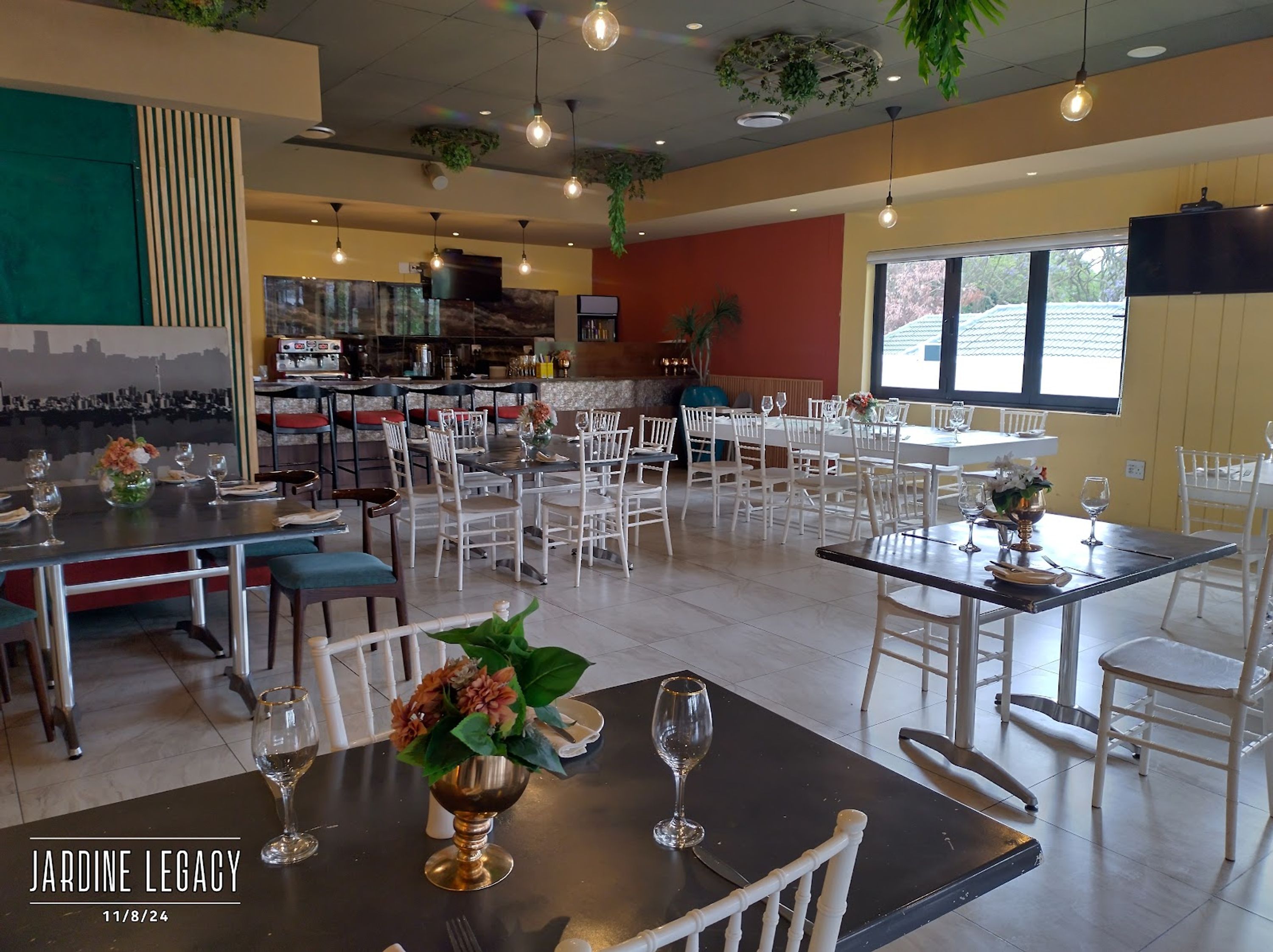 Questo locale elevato combina ristorante, bar e terrazza sul tetto in Oxford Road, Saxonwold, offrendo viste panoramiche sull'orizzonte di Johannesburg mentre serve pasti gourmet preparati con ingredienti biologici locali in un ambiente di giardino all'aperto.