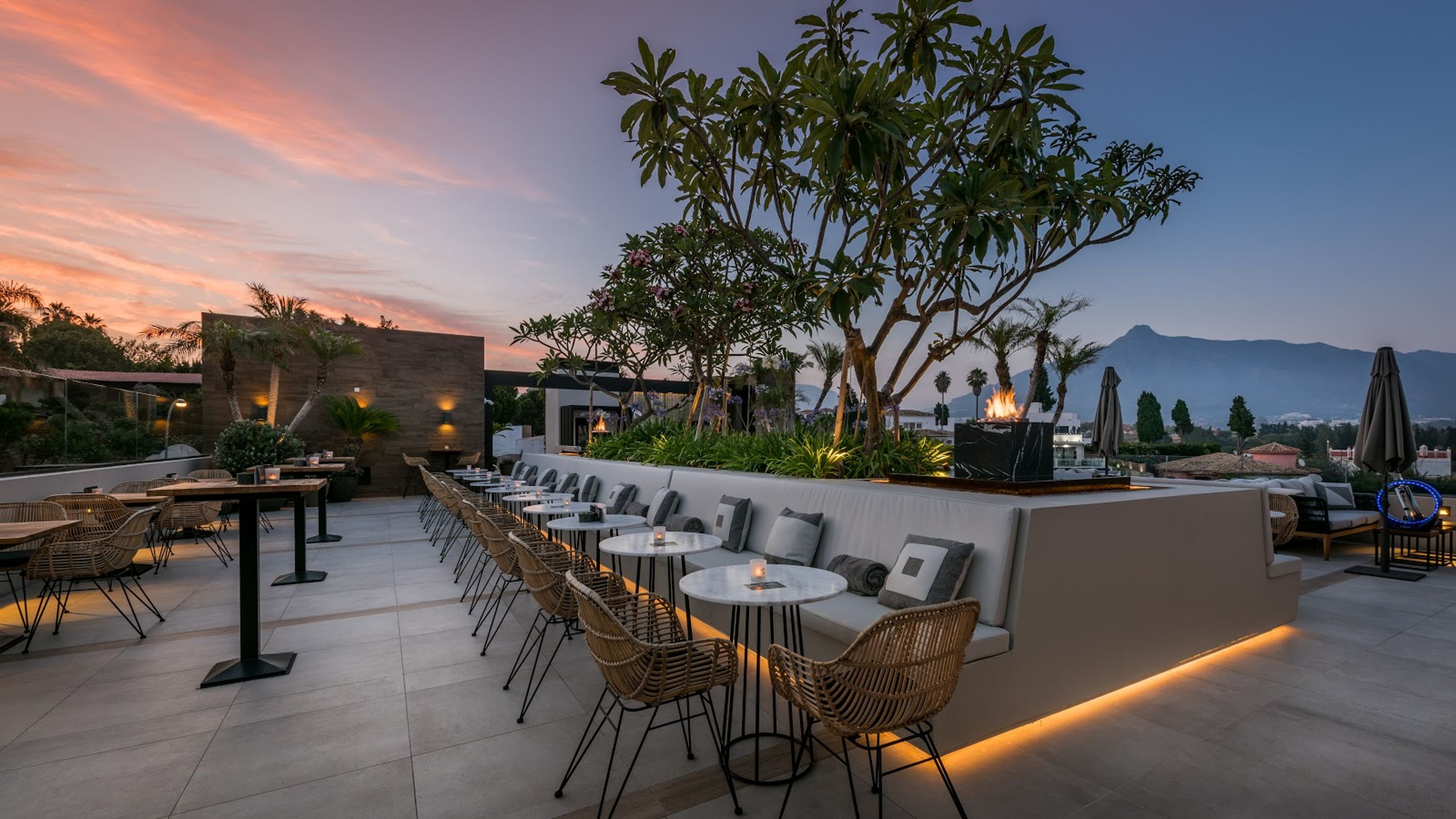 Questo cocktail bar sul tetto offre viste panoramiche su Puerto Banús e la montagna La Concha, combinando elementi di design moderno come giardini verticali, fontane d'acqua e raffinate aree lounge.