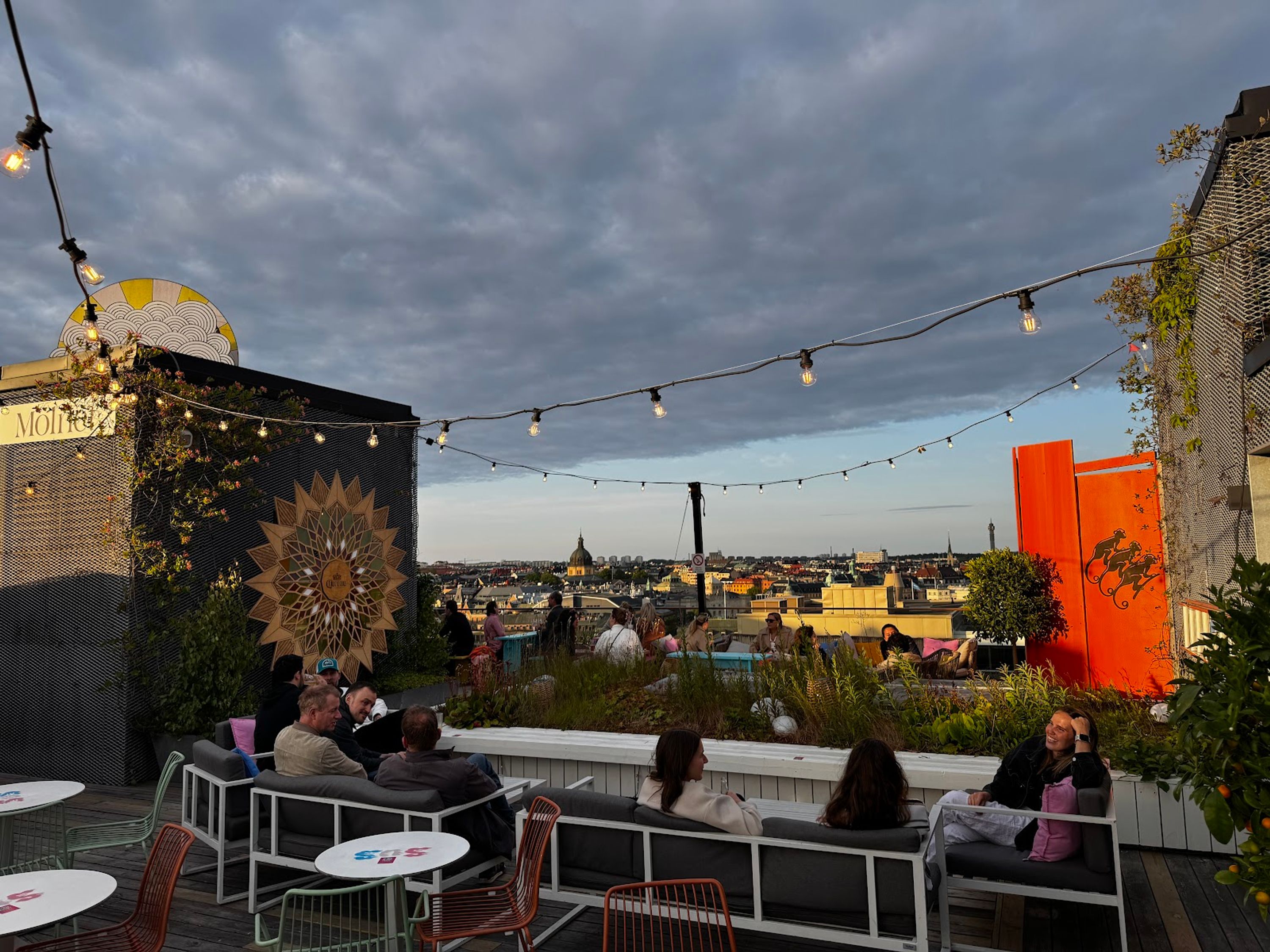 La terrazza presenta aree tematiche distinte incluso Molnet per cocktail raffinati e Djungeln, un paradiso tropicale completo di sabbia e palme che crea un'esperienza esotica all'interno del paesaggio urbano.