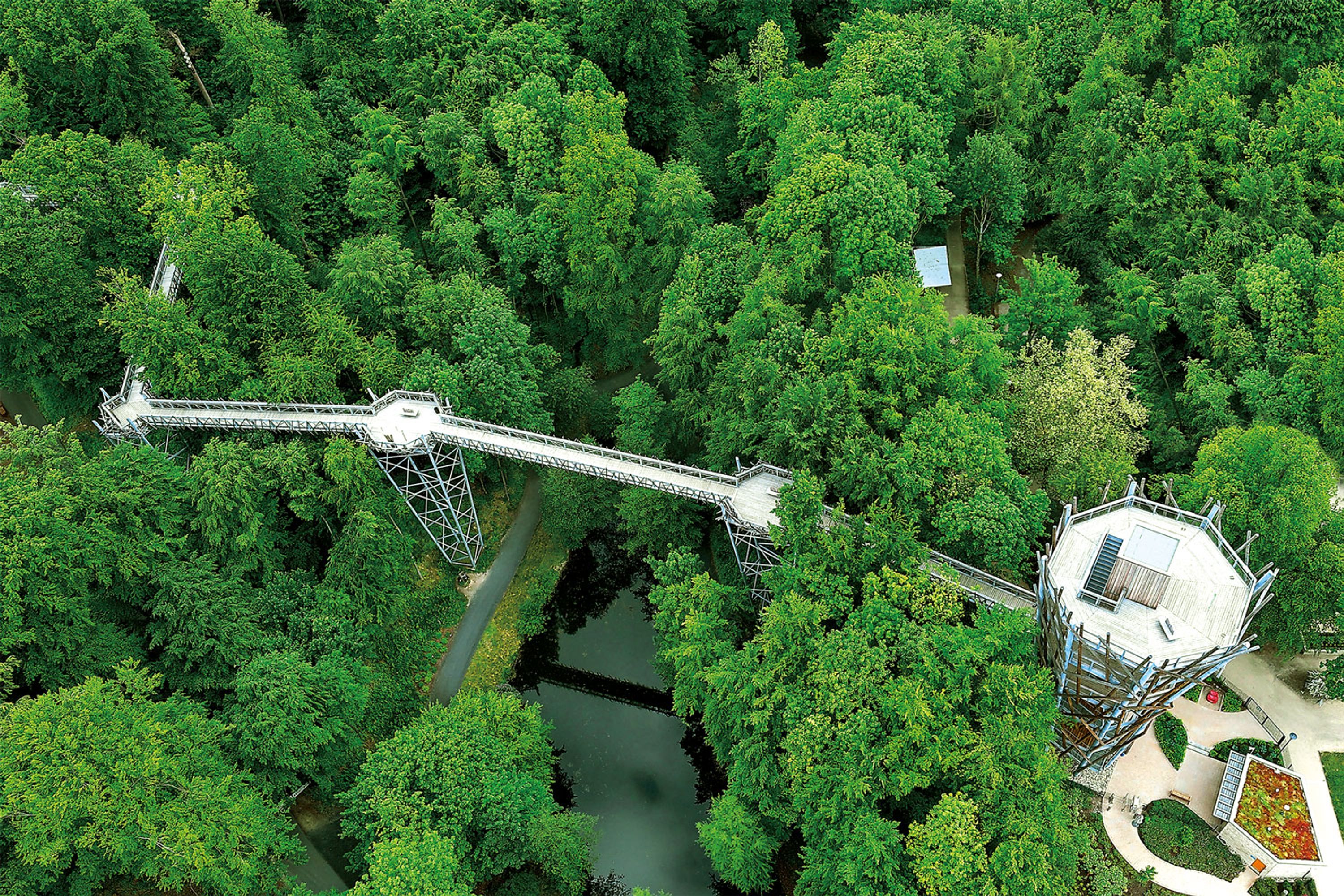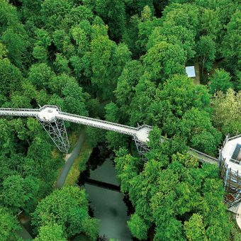 Il Baumwipfelpfad Bad Iburg si estende per 439 metri attraverso la canopia forestale a altezze fino a 28 metri dal suolo, offrendo accesso senza barriere tramite ascensori a tre diverse piattaforme di osservazione costruite con 600 tonnellate di acciaio e 250 metri cubi di legno.