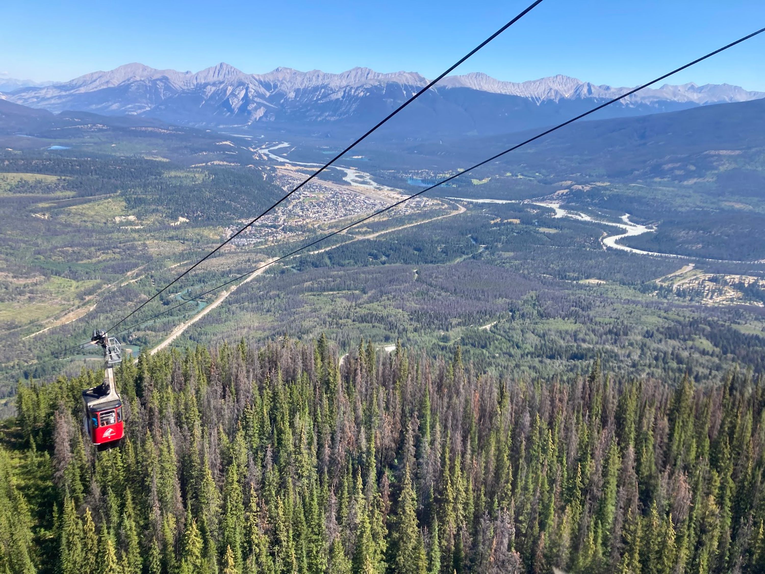 La Jasper SkyTram trasporta i passeggeri dalla stazione inferiore situata a 1.258 metri di altitudine alla stazione superiore vicino alla vetta del monte Whistlers a 2.463 metri, fornendo una salita di sette minuti con quasi 1.200 metri di dislivello attraverso finestre panoramiche che offrono viste montane senza ostacoli.
