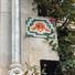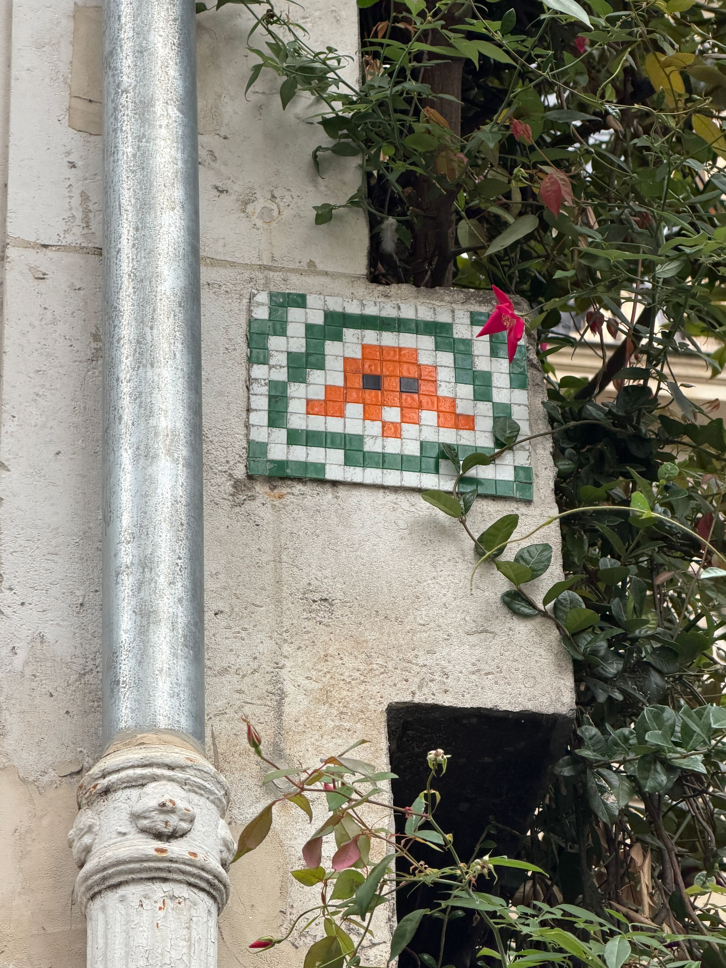 Questa mosaico mostra un invasore arancione grande con occhi neri quadrati e piccole zampe. È circondato da linee verdi angolari su sfondo bianco.