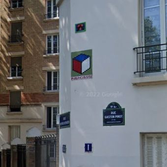 Questo mosaico di Invader raffigura un cubo con lati rossi, blu e bianchi realizzati con piccoli quadrati. In basso appare la scritta 'RUBIKCUBISME' su sfondo chiaro.