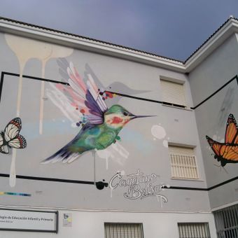Mural con el nombre del colegio Cayetano Bolívar junto a la imagen de un colibrí y dos mariposas.