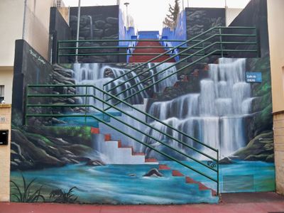 Mural que simula una cascada de agua cayendo por unas escaleras.