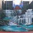 Mural que presentan dos niños navegando en una maleta sobre las aguas de una laguna prehistórica imaginaria.