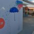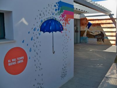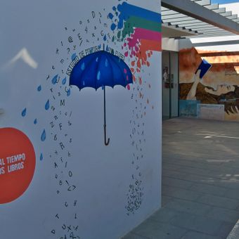 Mural que representa una mujer con los ojos cerrados con un libro abierto entre sus manos y un flujo de agua multicolor que se convierte en una lluvia de letras sobre un paraguas abierto que funciona como fotocol.