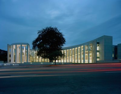 Questo edificio federale completato nel 2008 presenta un design curvo con colonne snelle, ampie facciate in vetro e pietra calcarea dell'Indiana, sottolineando la trasparenza e l'accessibilità mantenendo al contempo misure di sicurezza.