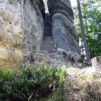 La fortezza di pietra presenta camere scolpite e un sistema di cisterna nelle scogliere di arenaria a sudest di Stráž pod Ralskem.