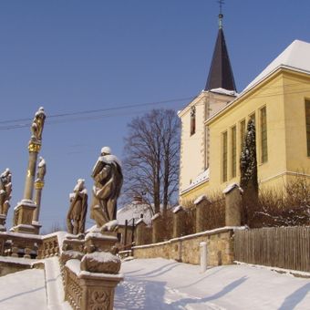 Sousoší barokních soch v Kunčině před kostelem