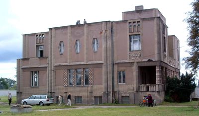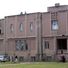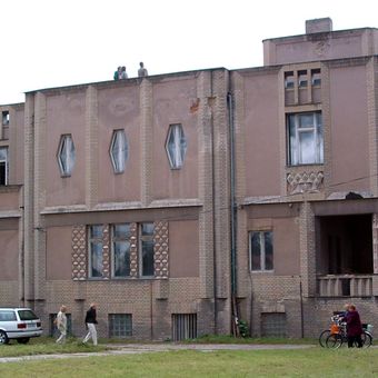 L'edificio in mattoni di due piani con tetto piano presenta finestre esagonali e forme geometriche in tutta la sua struttura.