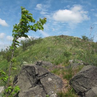 La vetta presenta formazioni geologiche specifiche che mostrano gli schemi rocciosi tipici della catena montuosa della Boemia Centrale.
