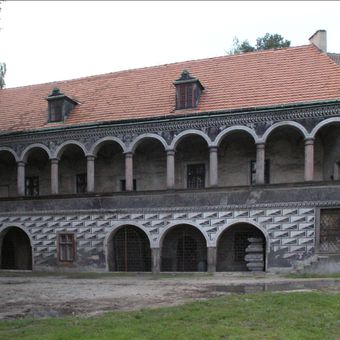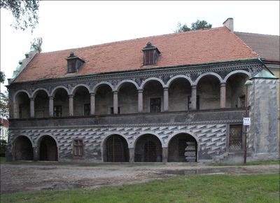 L'edificio mostra architettura rinascimentale con influenze italiane, comprese tecniche di intonacatura doppia che creano motivi decorativi in bianco e nero.