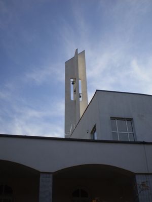 La Chiesa di Maria Ausiliatrice presenta elementi architettonici moderni con un campanile prominente e interni spaziosi per gli incontri comunitari.