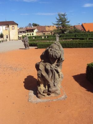 Torzo sochy štítonoše v klášterní zahradě v České Lípě