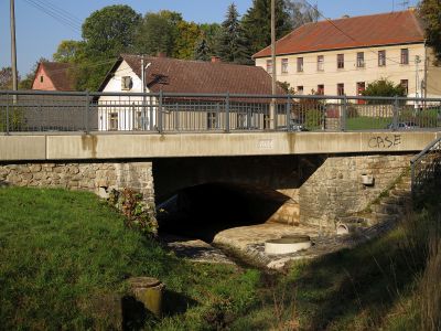 Most silnice II/150 přes Křivosoudovský potok v Křivosoudově, pískovcový jednoobloukový most překrytý moderní mostovkou