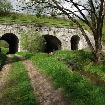 Železniční most přes Hučnici, kamenný tříobloukový most přes Hučnici a souběžné polní cesty na hranici Starých a Nových Dobrkovic