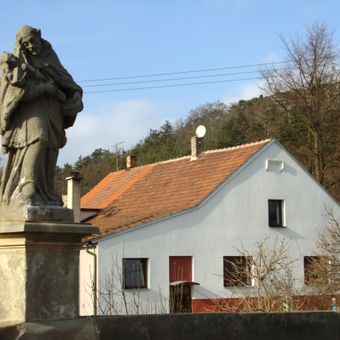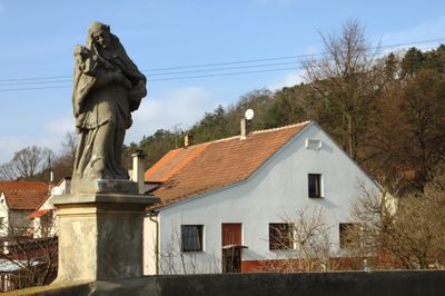 Boží muka a socha sv. Jana Nepomuckého na mostě v Sazené, boží muka v obci Sazená, okres Kladno