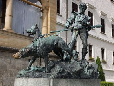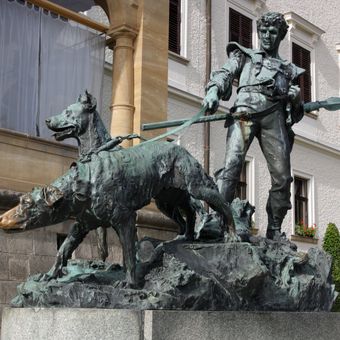 Socha lovce před hlavní budovou zámku Konopiště, statue in Benešov, Czech Republic