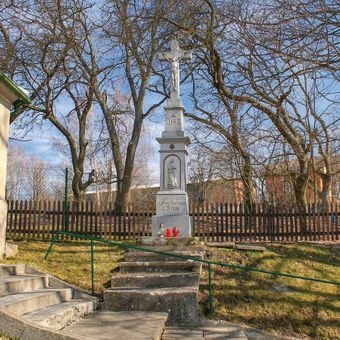 Kříž v Radomilově u kaple na návsi, pamětní kříž v obci Ruda nad Moravou, okres Šumperk
