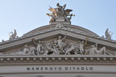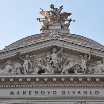 Sochy na a ve štítu Mahenova divadla v Brně, statue in Brno-město, Czech Republic