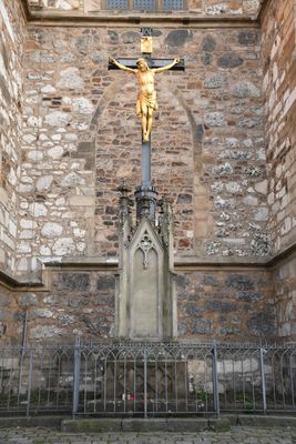Crucifix in front of north facade of the Cathedral of Saints Peter and Paul in Brno