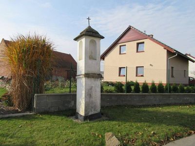 Sloup se sochou Panny Marie v Troubelicích naproti kostelu