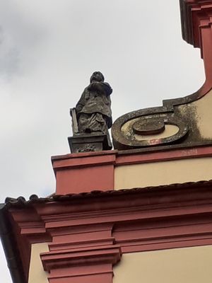 Socha svatého Floriána vpravo na atice kostela svatého Václava v Budyni nad Ohří