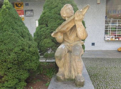 Socha chlapce s raketou před poštou v Seifertově ulici v Neštěmicích, statue in Ústí nad Labem, Czech Republic