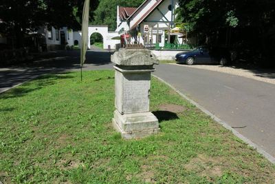 Podstavec s ulomeným kovovým křížem u penzionu První mlýn v Bezručově údolí