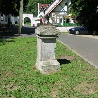 Podstavec s ulomeným kovovým křížem u penzionu První mlýn v Bezručově údolí, pamětní kříž v obci Blatno, okres Chomutov