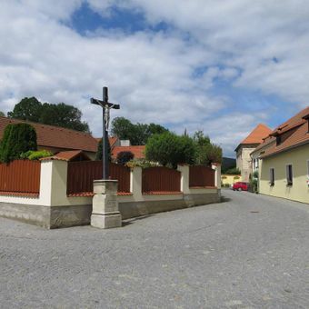 Kříž před kostelem Nanebevzetí Panny Marie ve Zlaté Koruně, pamětní kříž v obci Zlatá Koruna, okres Český Krumlov