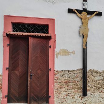 Kříž na zdi kostela ve Skočicích, pamětní kříž v obci Skočice, okres Strakonice