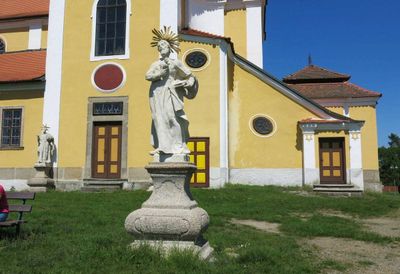 Socha světce uprostřed na terase kostela Nanebevzetí v Chlumu u Třeboně