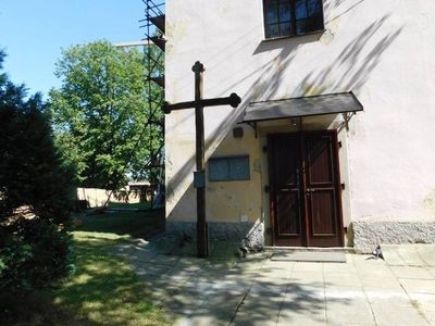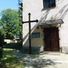 Boží muka u zdi kostela ve středu Keblova