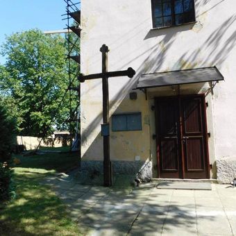 Dřevěný kříž u kostela v Keblově, pamětní kříž v obci Keblov, okres Benešov
